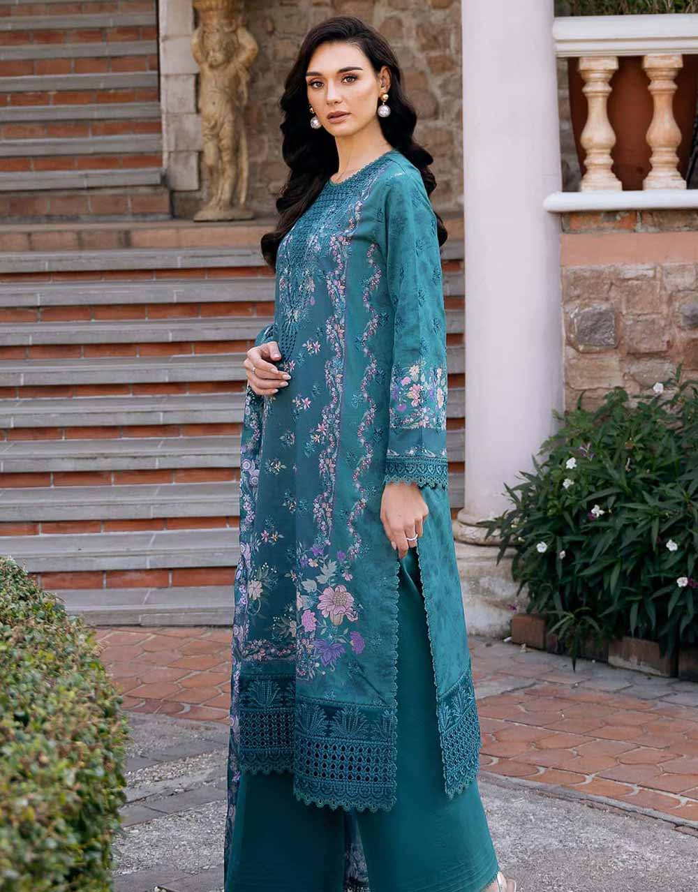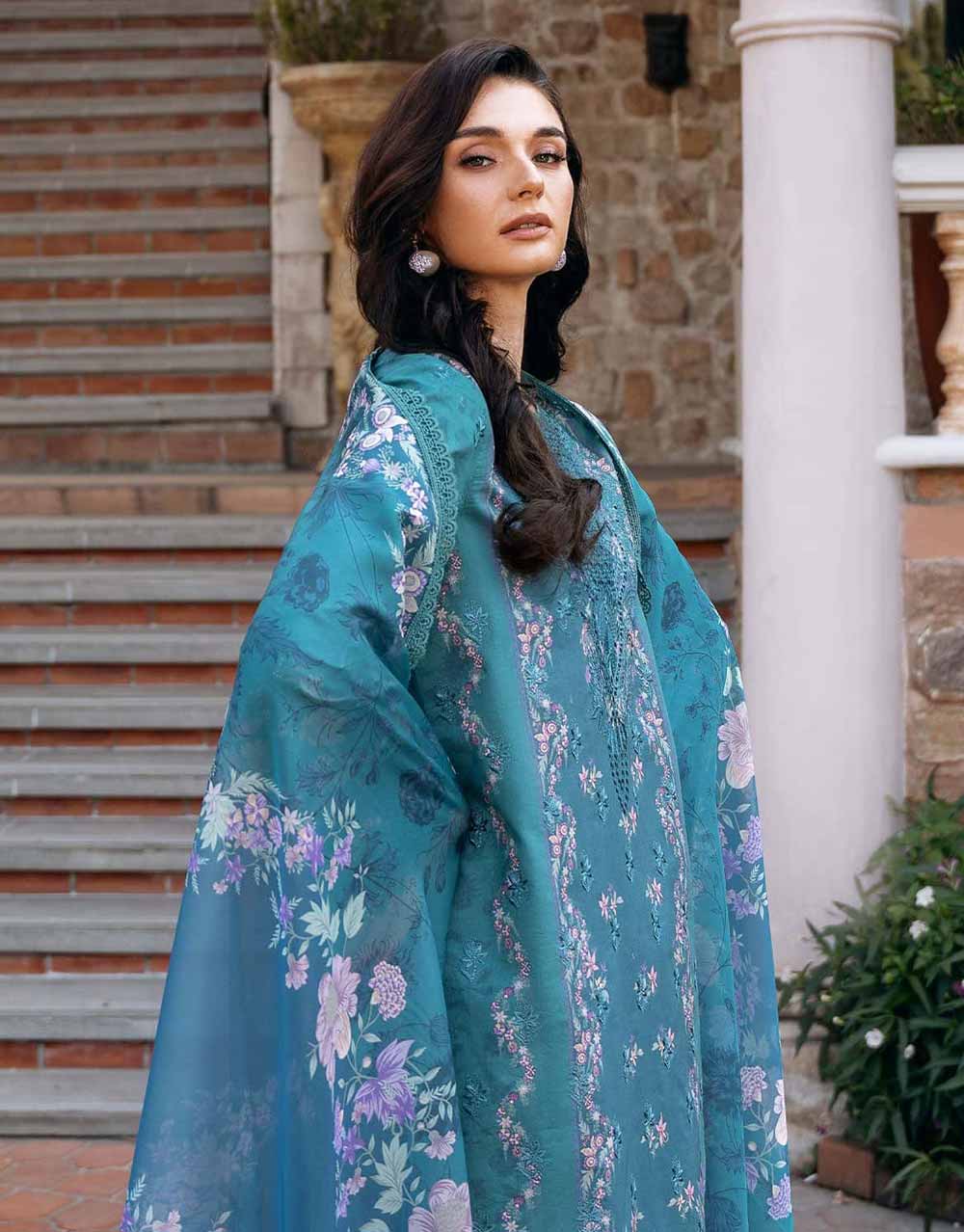 Intricate threads and artistic blend beautifully showcases embroidered digital prints on the front, back and sleeves accented with organza borders a digital printed silk dupatta and a dyed cotton trouser for a chic refreshing look.