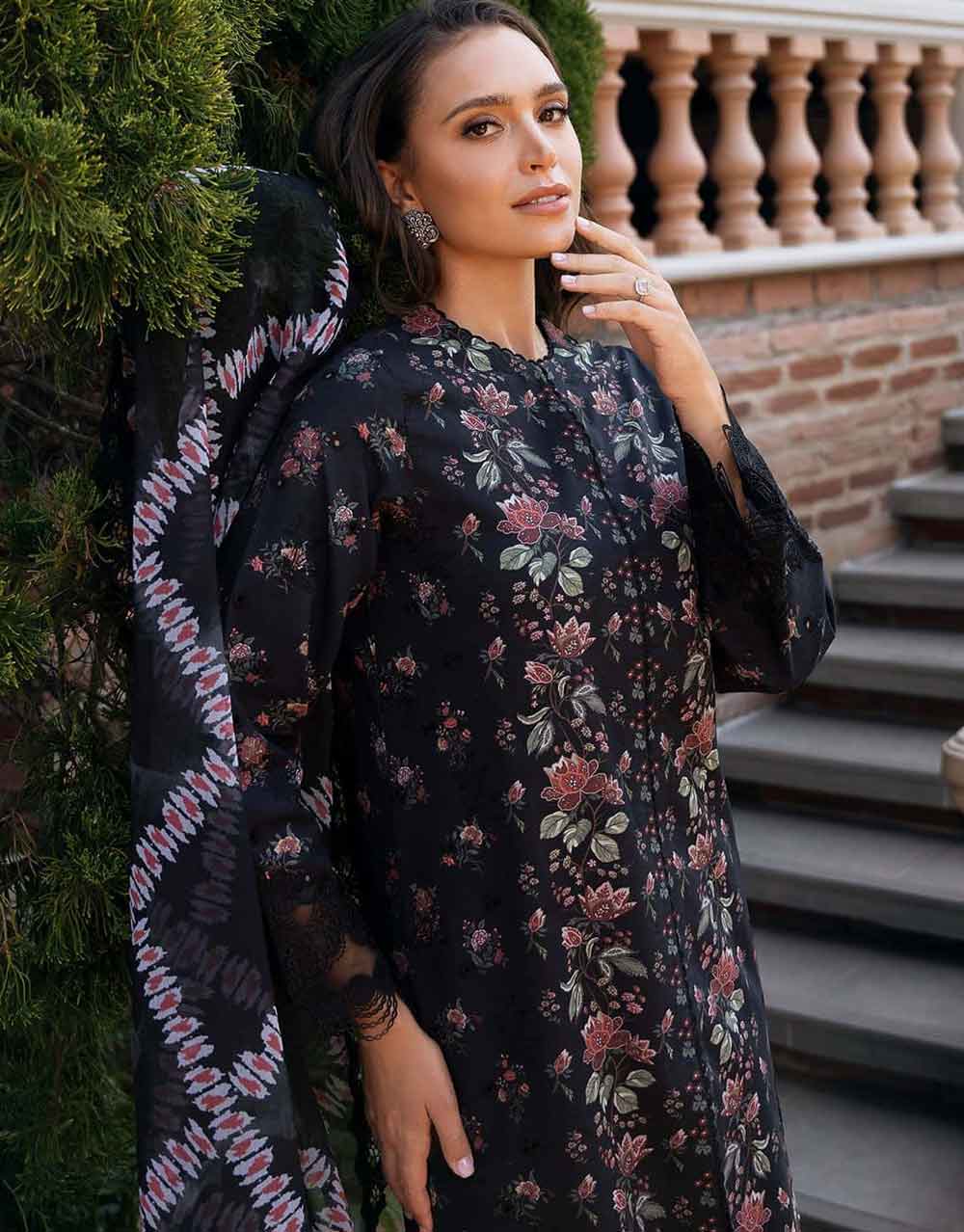 Tradition meets modern design.Embroidered borders bring the whole look together while the digital printed dupatta adds a touch of charm. Paired perfectly with a dyed trouser this ensemble speaks sophistication.