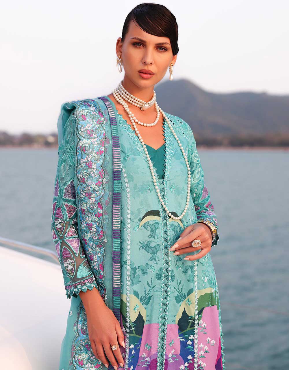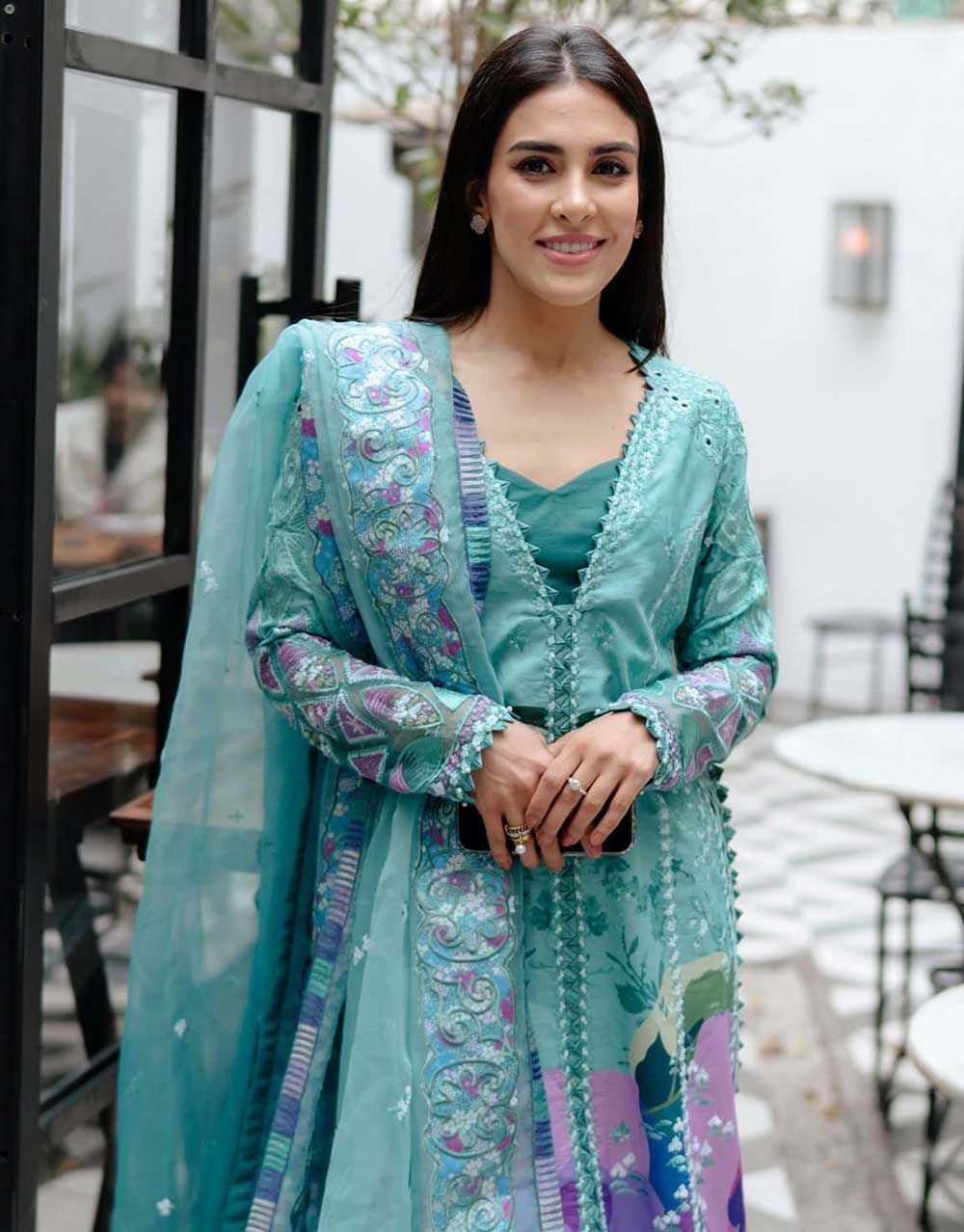 Suffused in a serene blue, this ethereal ensemble exudes grace and sophistication, with its soft, delicate fabric draping effortlessly to create a timeless silhouette. The luxurious silk, adorned with exquisite digital prints, adds a contemporary touch, as vibrant hues and intricate designs dance across the fabric, enhancing its opulent allure. Complementing the ensemble, the airy cotton net dupatta flows with effortless fluidity, its gossamer texture adding a whisper of elegance and lightness. A harmonious blend of classic beauty and modern artistry, this ensemble radiates luxurious refinement and effortless charm.