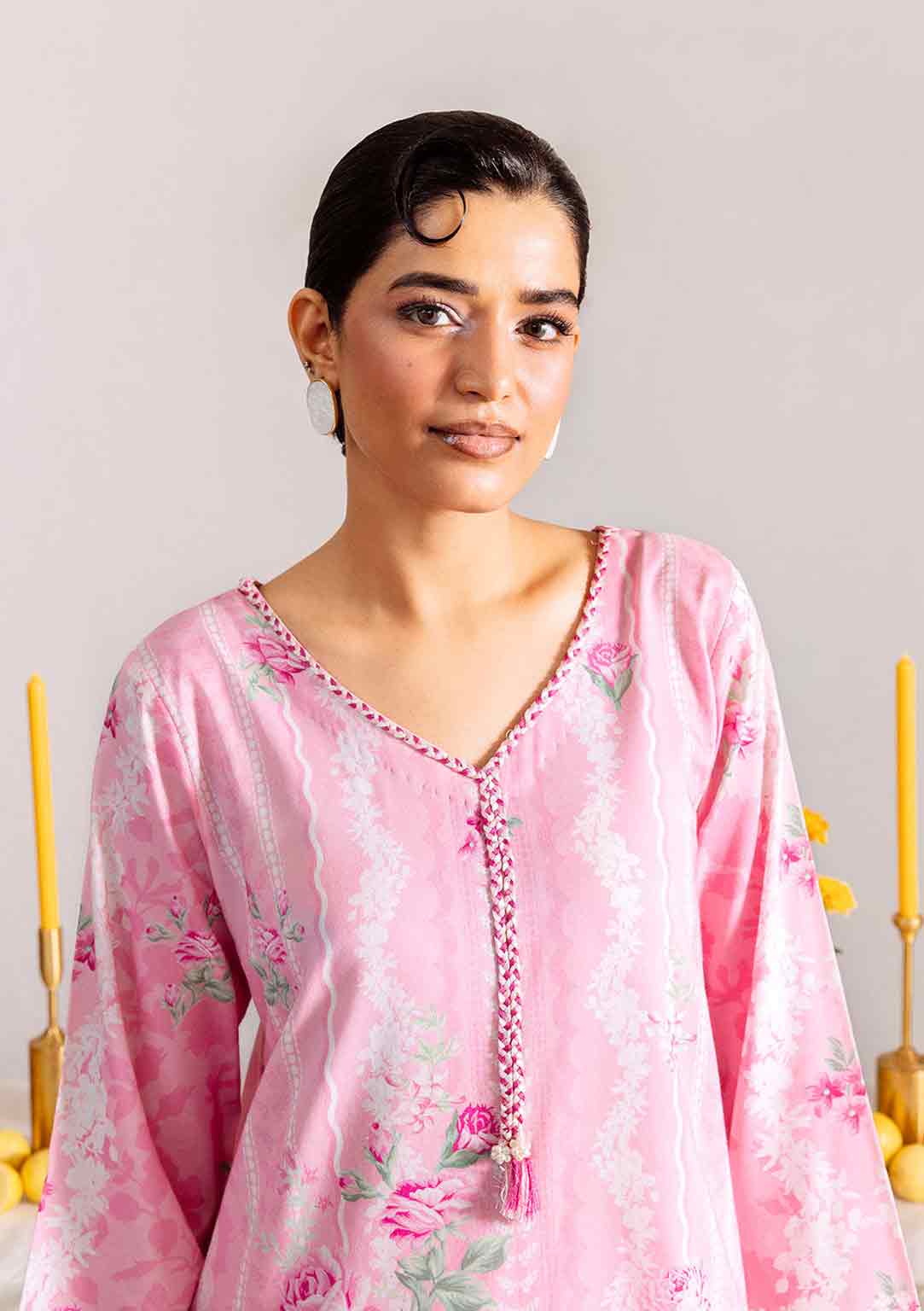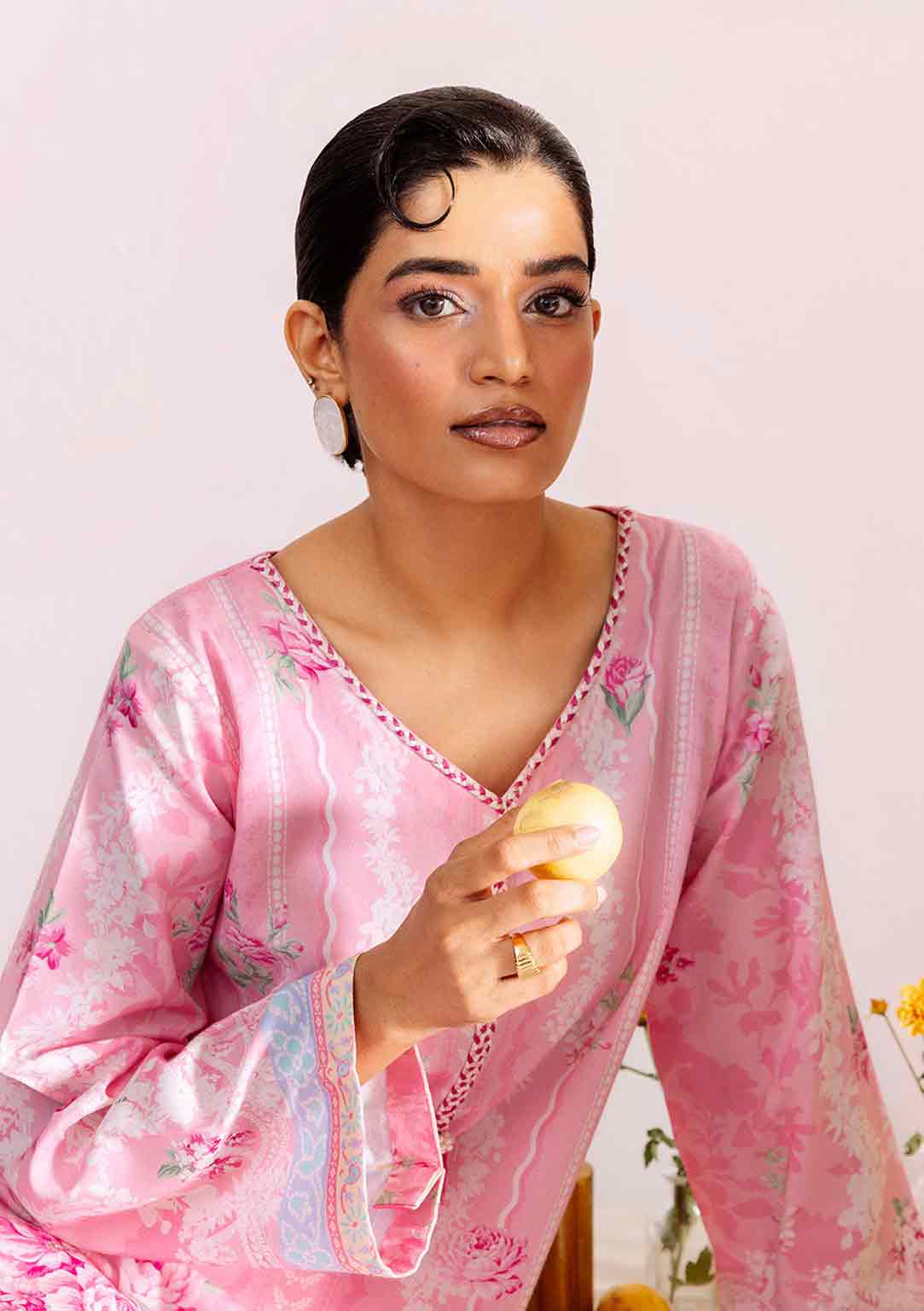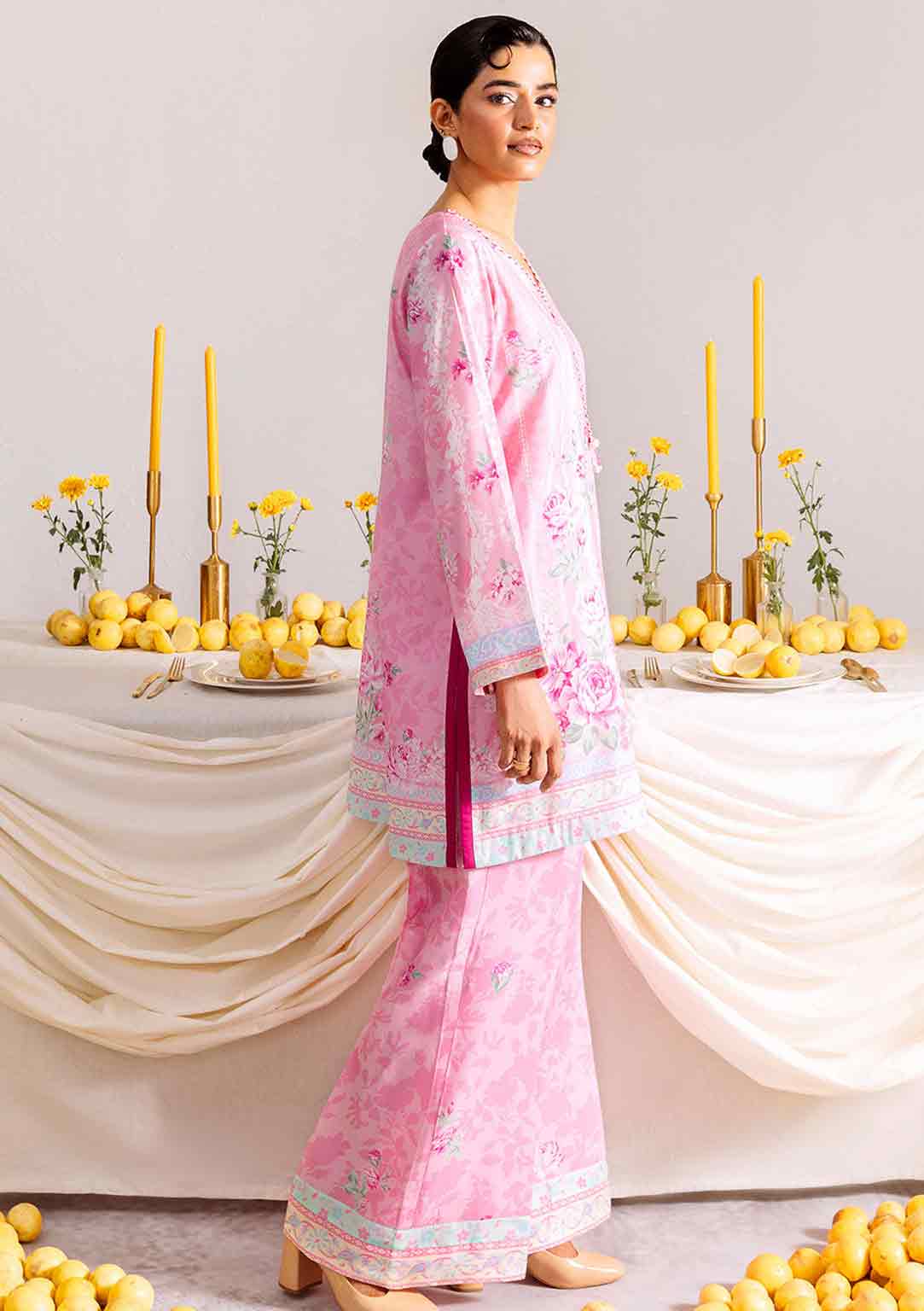 - Soft pink Co-ord printed ensemble adorned with delicate floral patterns and pastel blue borders for a refreshing, feminine look.