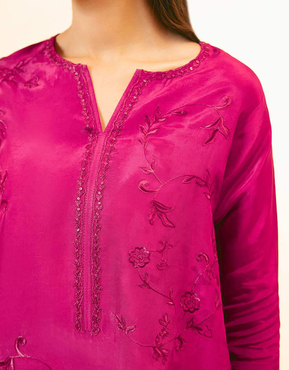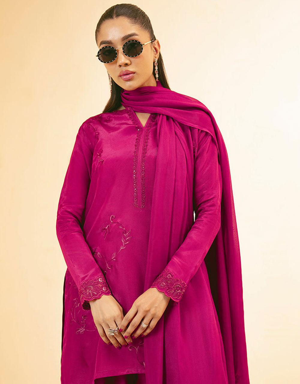 Out of your Eid wishlist: Rose Farshi Set. It features an embroidered short shirt and our signature Farshi shalwar. Elevate the look with a medium silk dupatta, detailed with embroidery patches, for a complete and refined style.