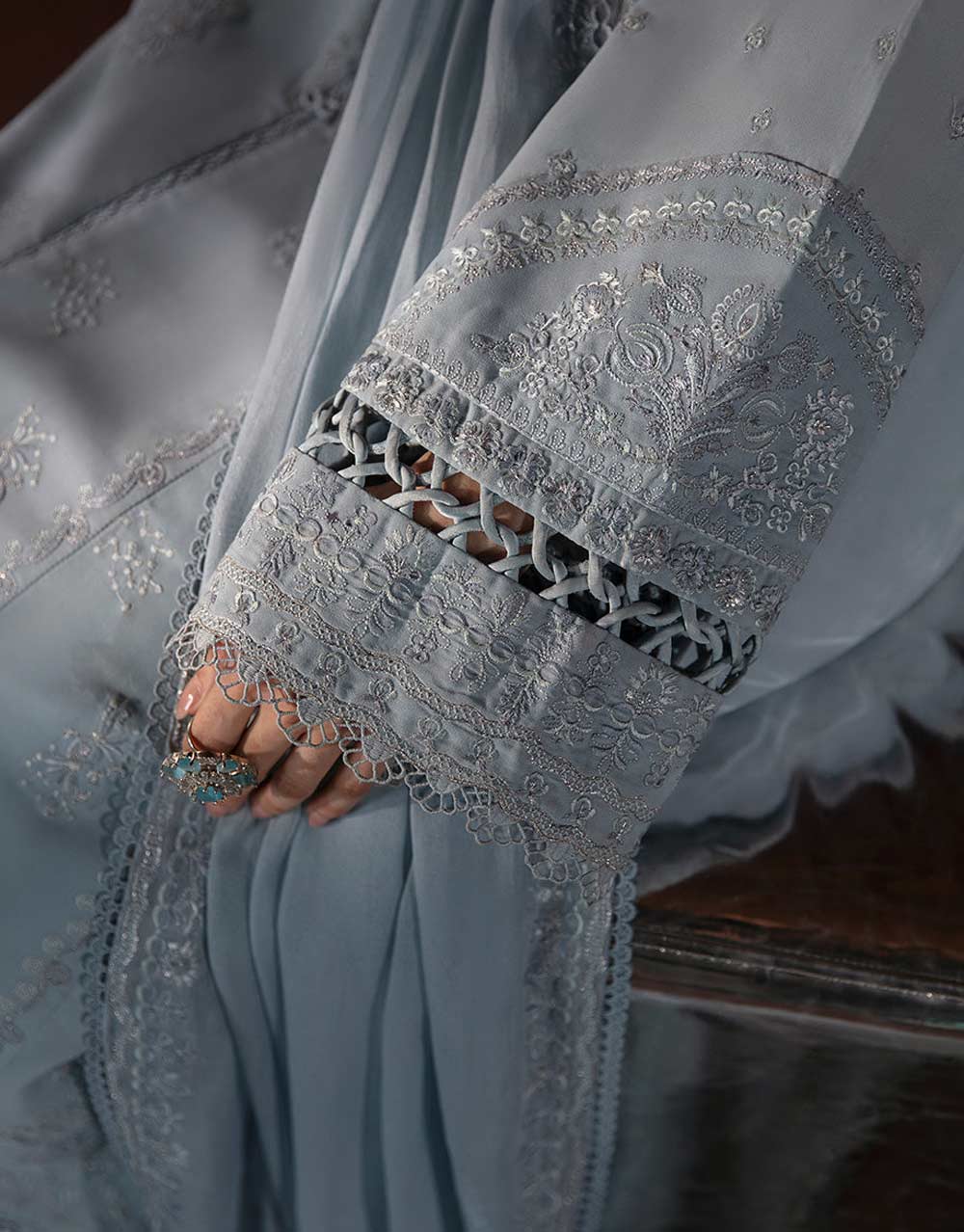 In a mesmerizing ice gray hue, “Chéri” reveals intricate embroidery in soft, nuanced patterns, meticulously stitched with precision threadwork and highlighted by shimmering silver accents. The design features a gracefully open-front silhouette, flared to perfection, with whimsical tribal motifs gently cascading across the fluid fabric, evoking a sense of refined femininity. Paired with a coordinating chiffon dupatta, this ensemble exudes a timeless elegance that radiates sophistication in every detail.