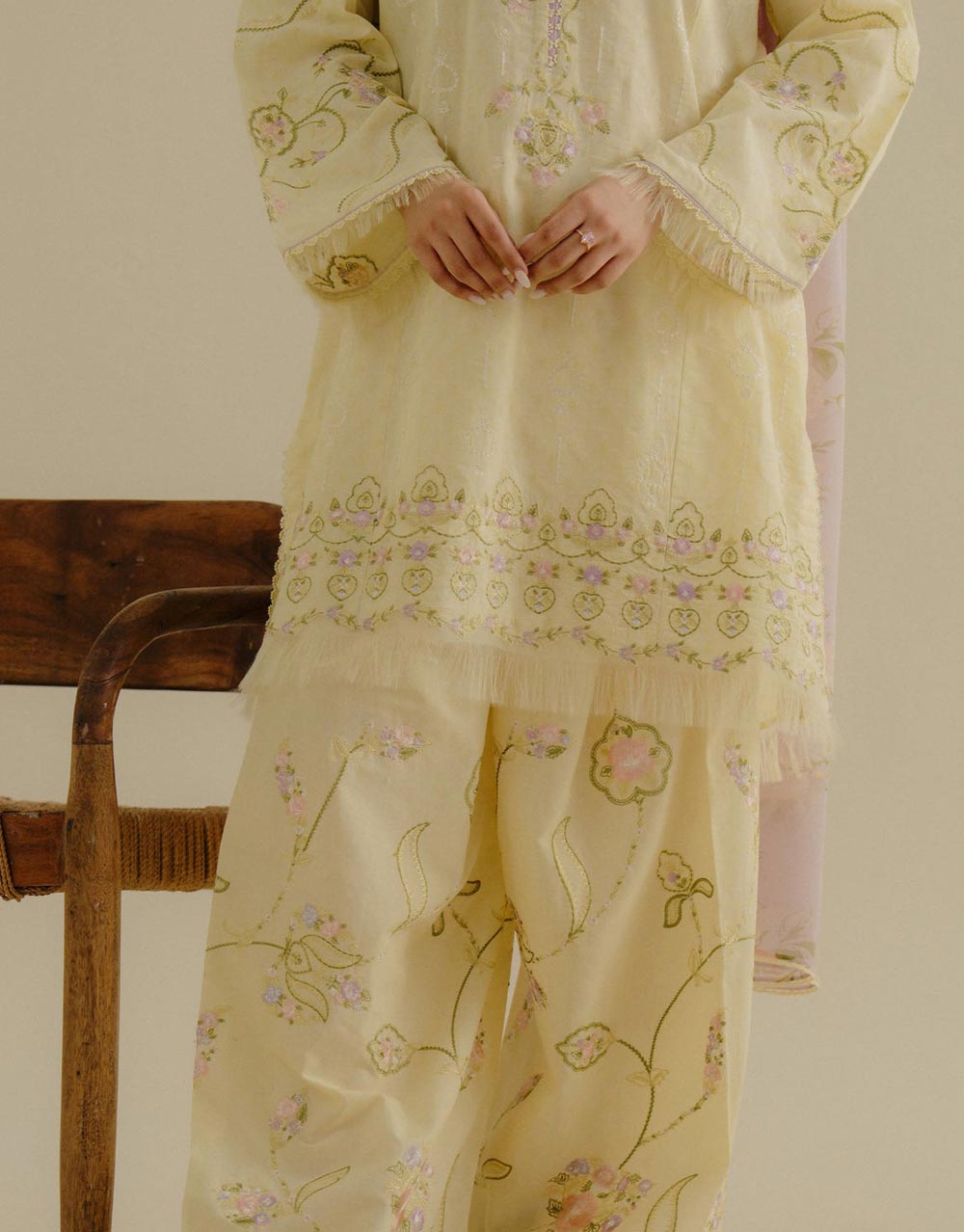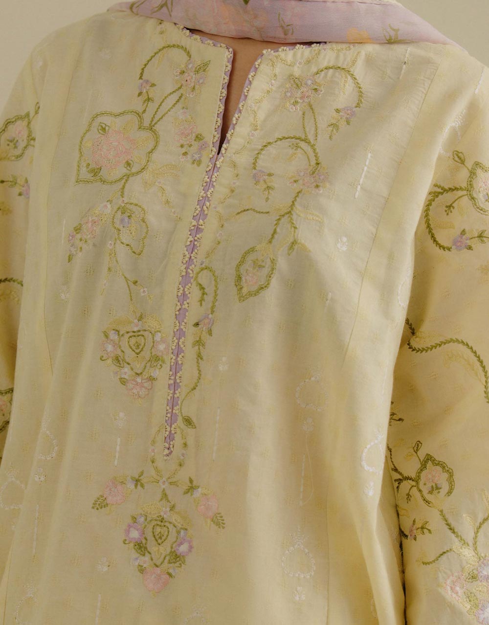A soft buttercup yellow base adorned with delicate embossed textures and fine tonal embroidery, capturing a light and effortless elegance, finished with a breezy chiffon dupatta for a graceful touch.