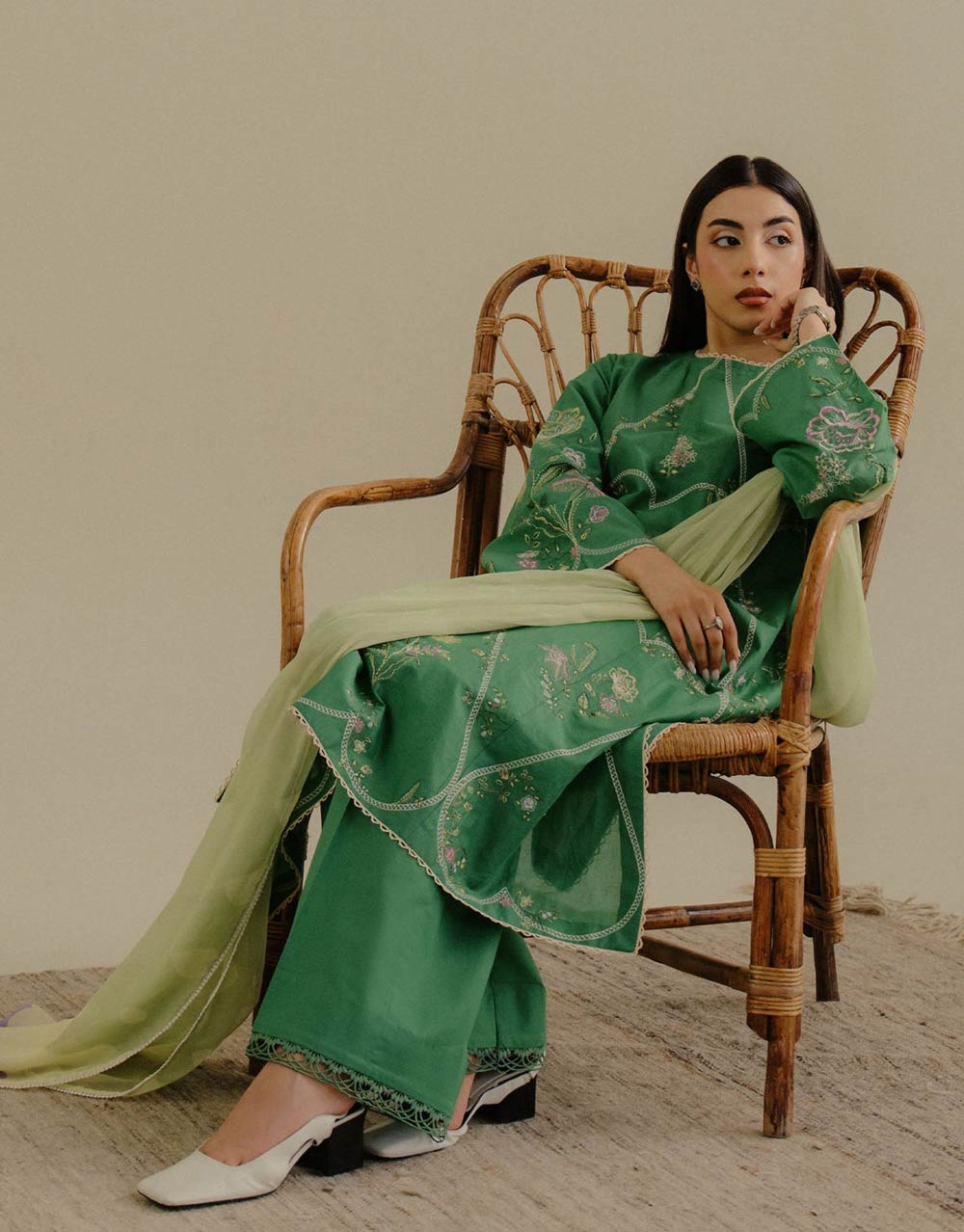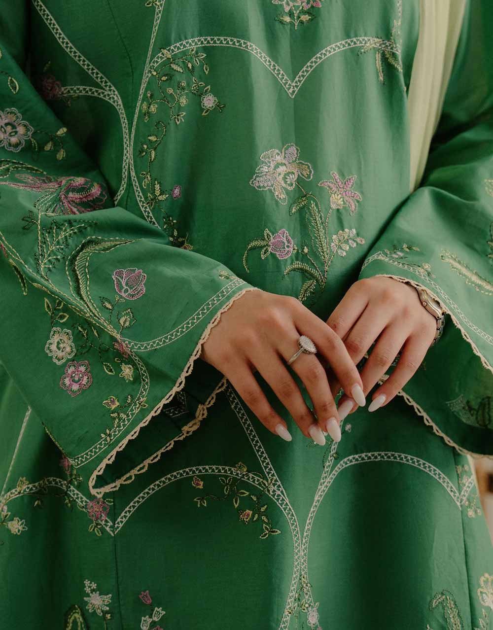 The fresh green Lawn, accented with pink detailing, is beautifully complemented by a delicate chiffon dupatta for a vibrant, airy look.