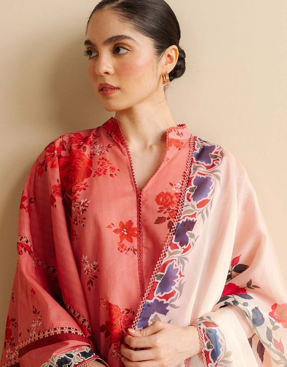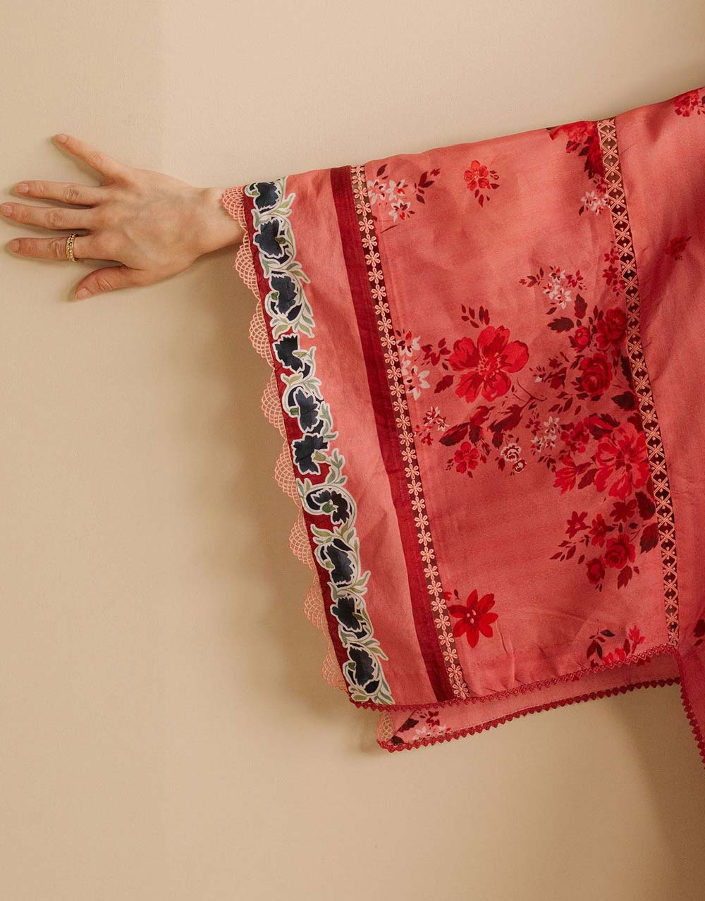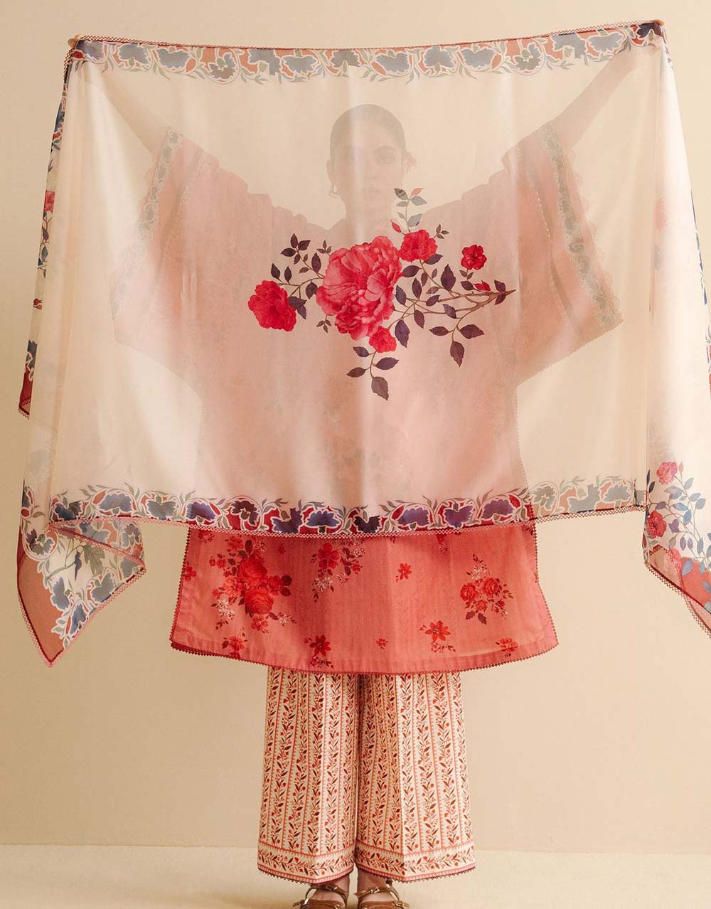 A pink coral floral-printed shirt paired effortlessly with ivory trousers and a soft, flowy dupatta blooming in pastel watercolor hues.