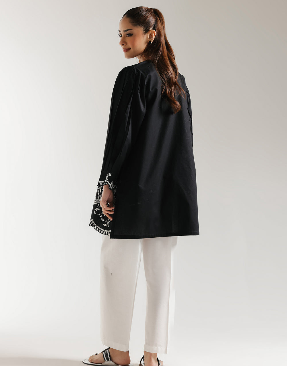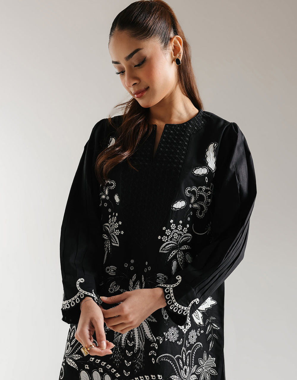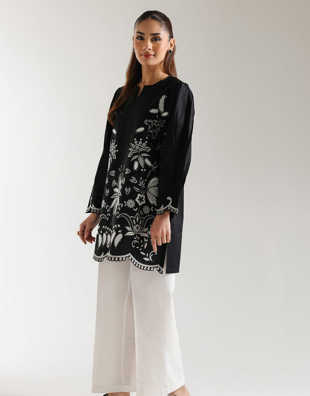This modernly designed shirt exudes grace and elegance with its sleek silhouette. The deep black color is both mesmerizing and timeless, while the intricate embroidery in white floral patterns adds a touch of sophistication. The scalloped sleeves and bottom opening elevate the overall look. Perfect for casual summer gatherings, this tunic offers a stylish option for any occasion.