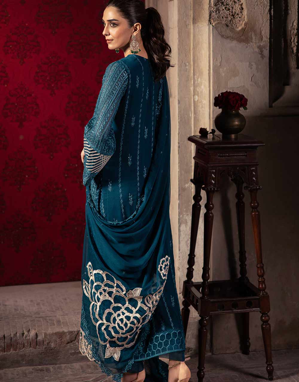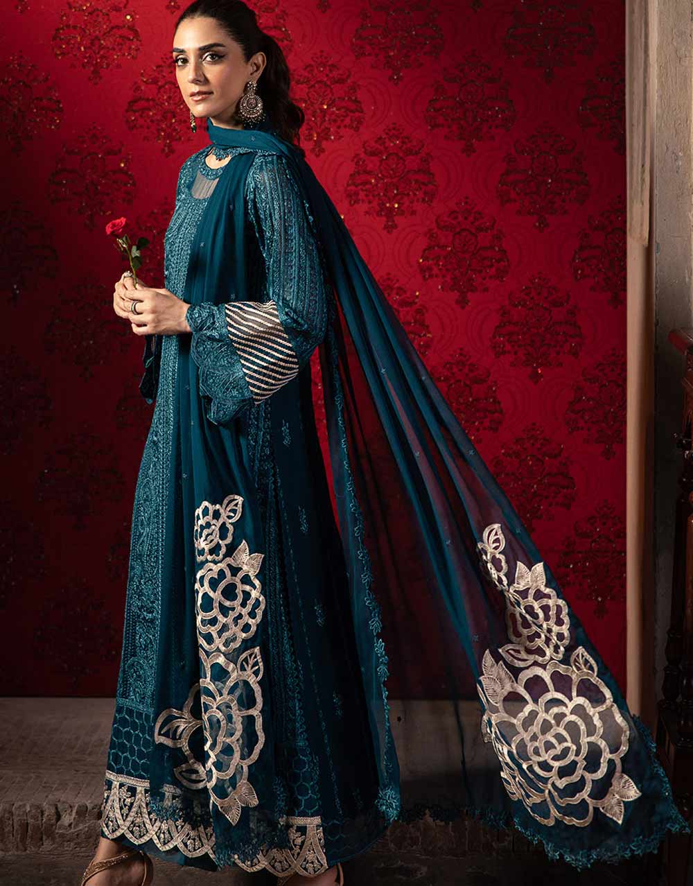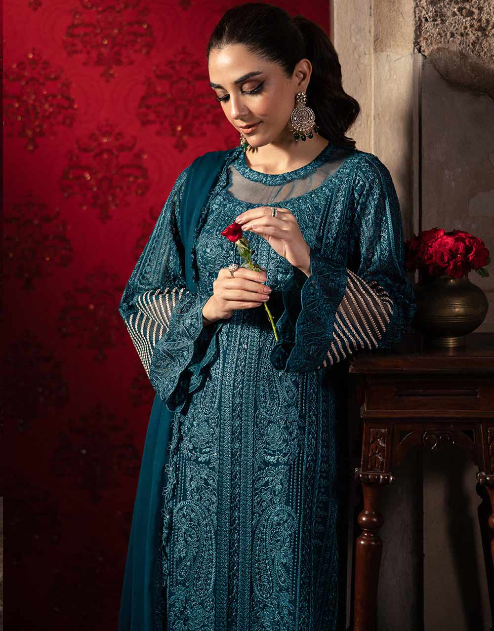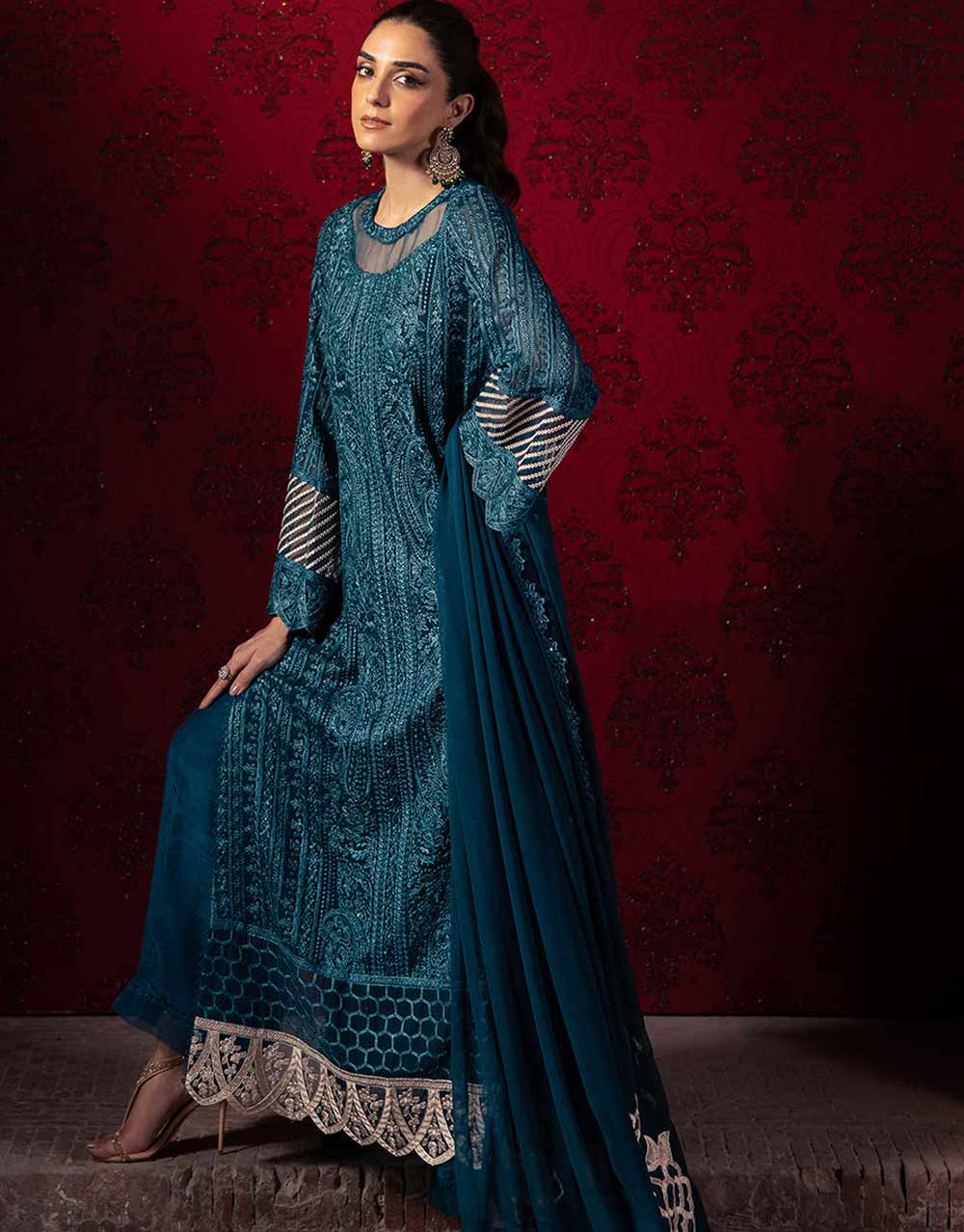 Introducing Emerald Grace – a luxe masterpiece in radiant teal green, crafted to captivate. With its sparkling sequins embroidered chiffon dupatta, this ensemble brings unmatched elegance to every celebration