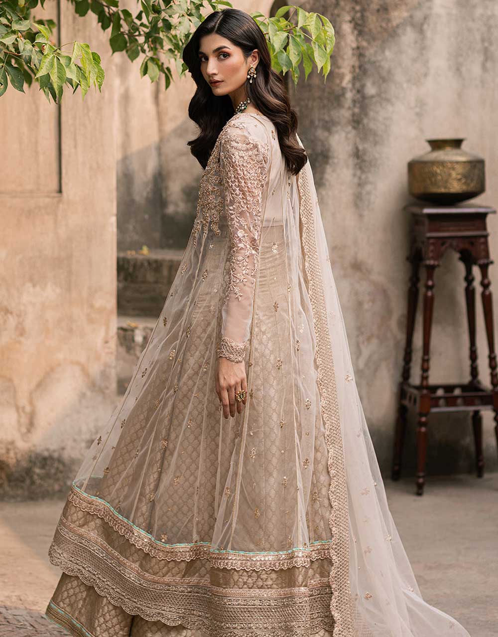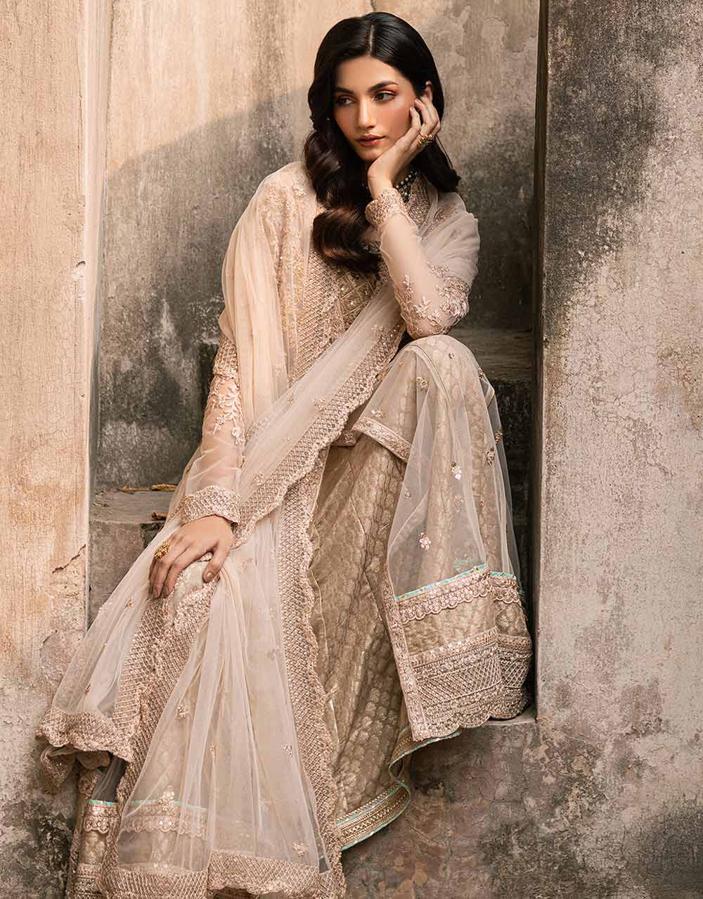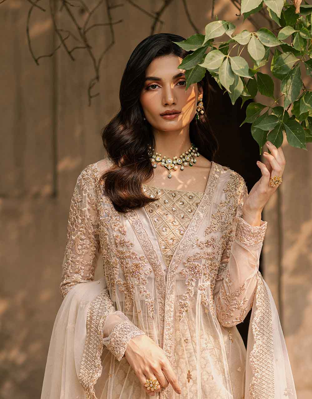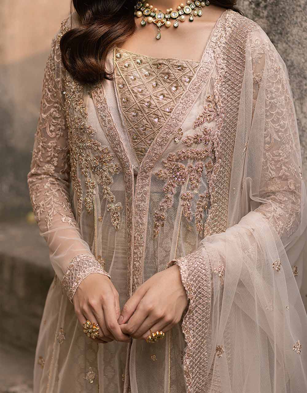 Introducing Ethereal Majesty – a breathtaking beige ensemble that radiates grace. Featuring a sequins embroidered net dupatta, this luxurious piece brings a perfect blend of elegance and allure, making it an unforgettable choice for any special occasion.