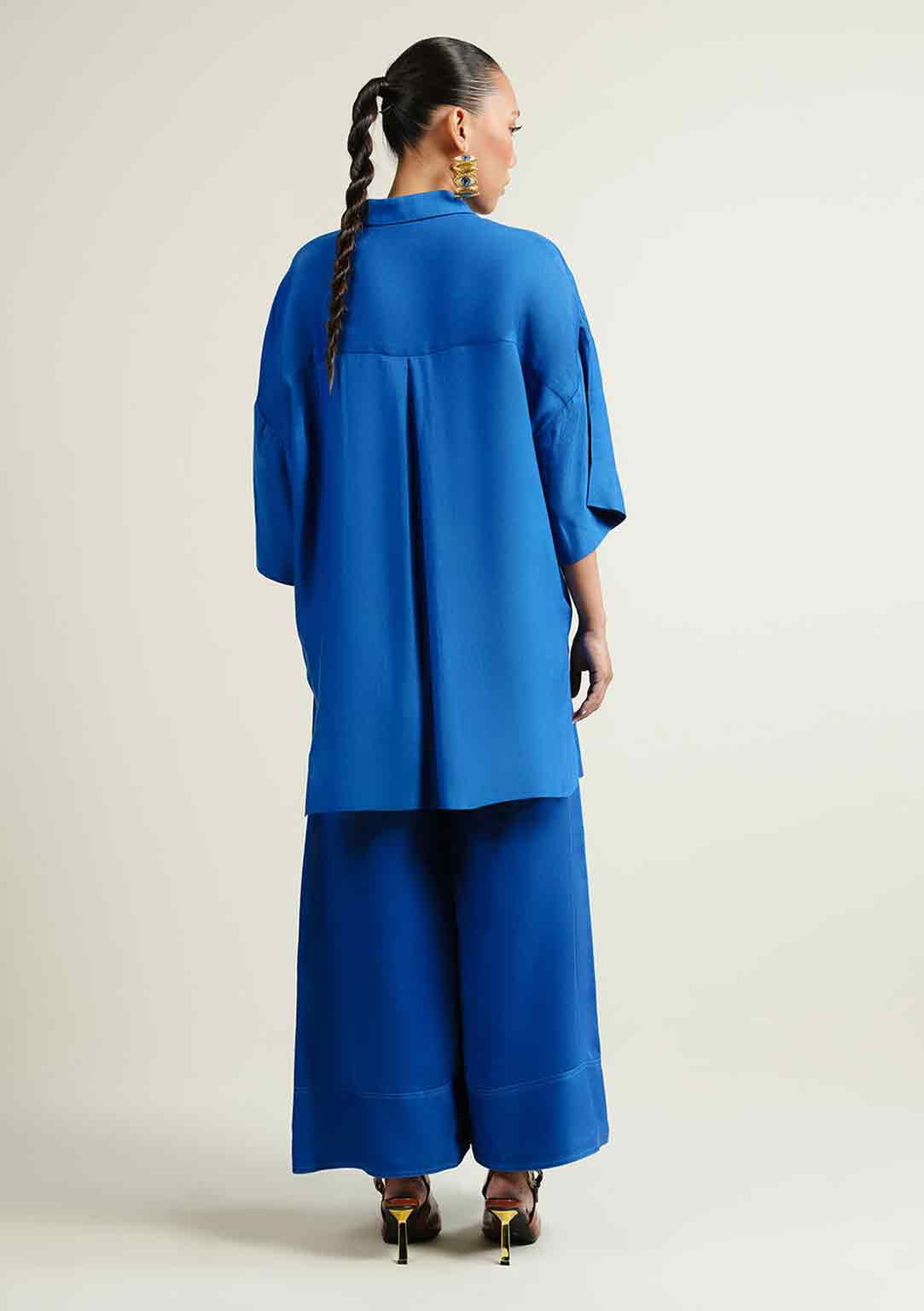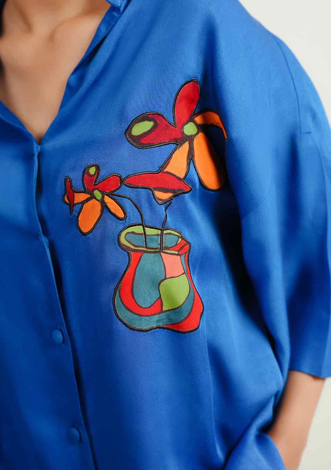 - Crafted from fluid viscose satin, this button-down shirt features a two-piece collar and a front placket. Designed with drop shoulders and three-quarter sleeves for a relaxed silhouette, It elevated by a printed patch on the front. Finished with a rounded hem and side slits for effortless movement and style.