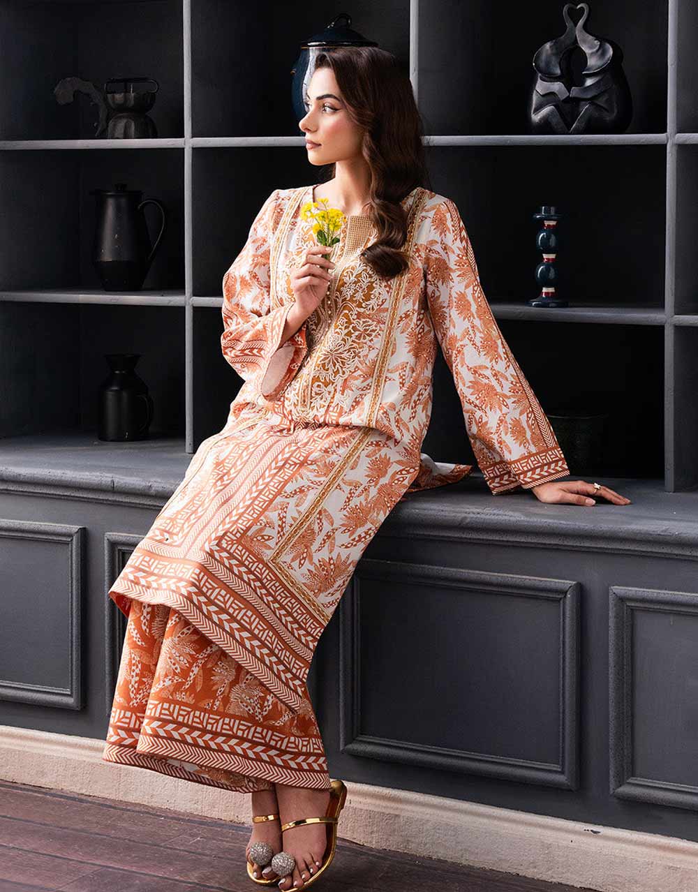 - Step into refined style with this 2-piece Pret set in a rich mustard beige shade. The printed lawn shirt pairs effortlessly with cambric printed trousers, accentuated by finely crafted organza patches for a touch of graceful charm.