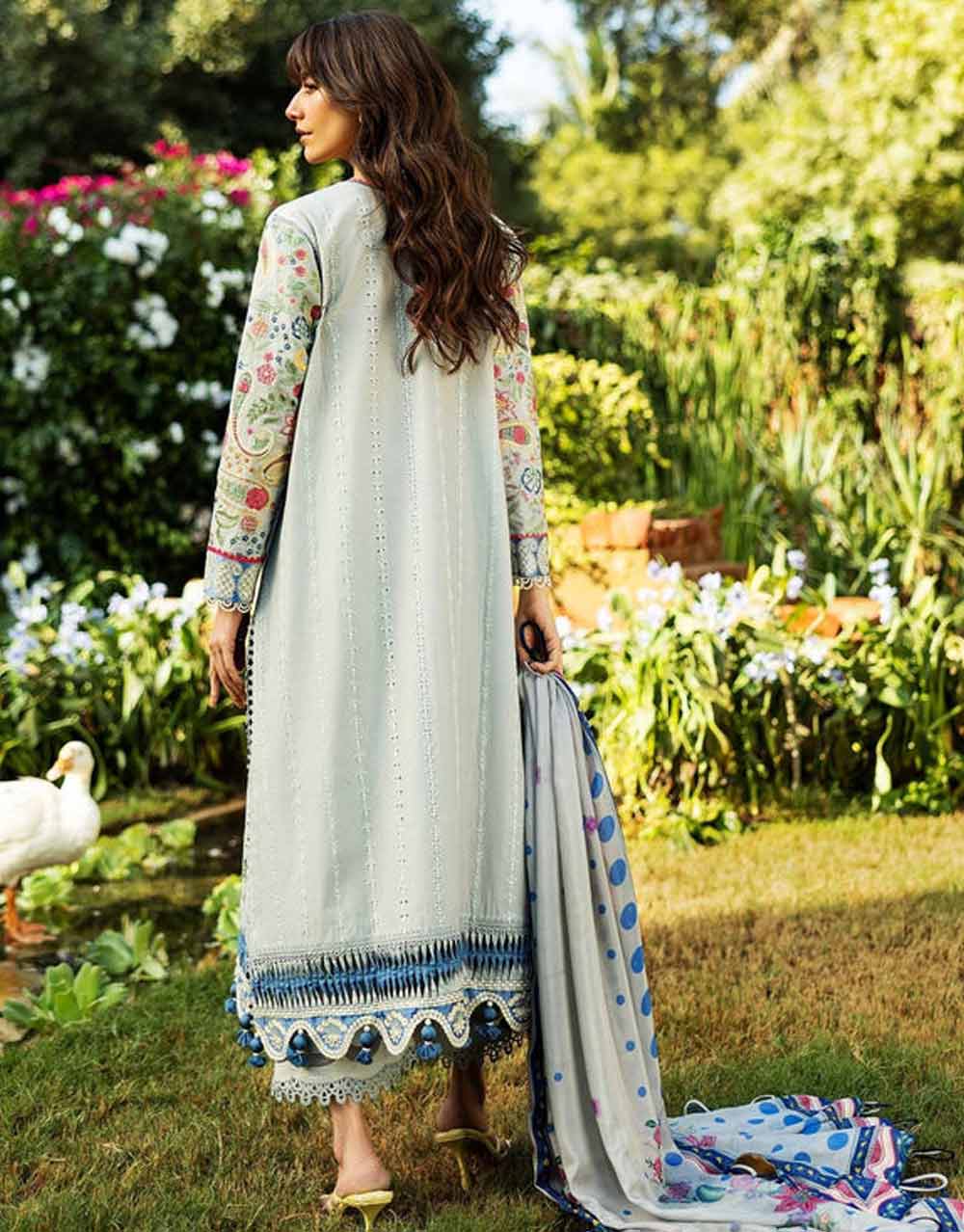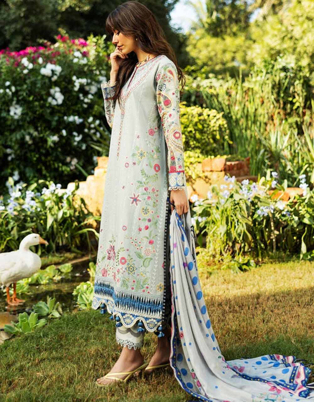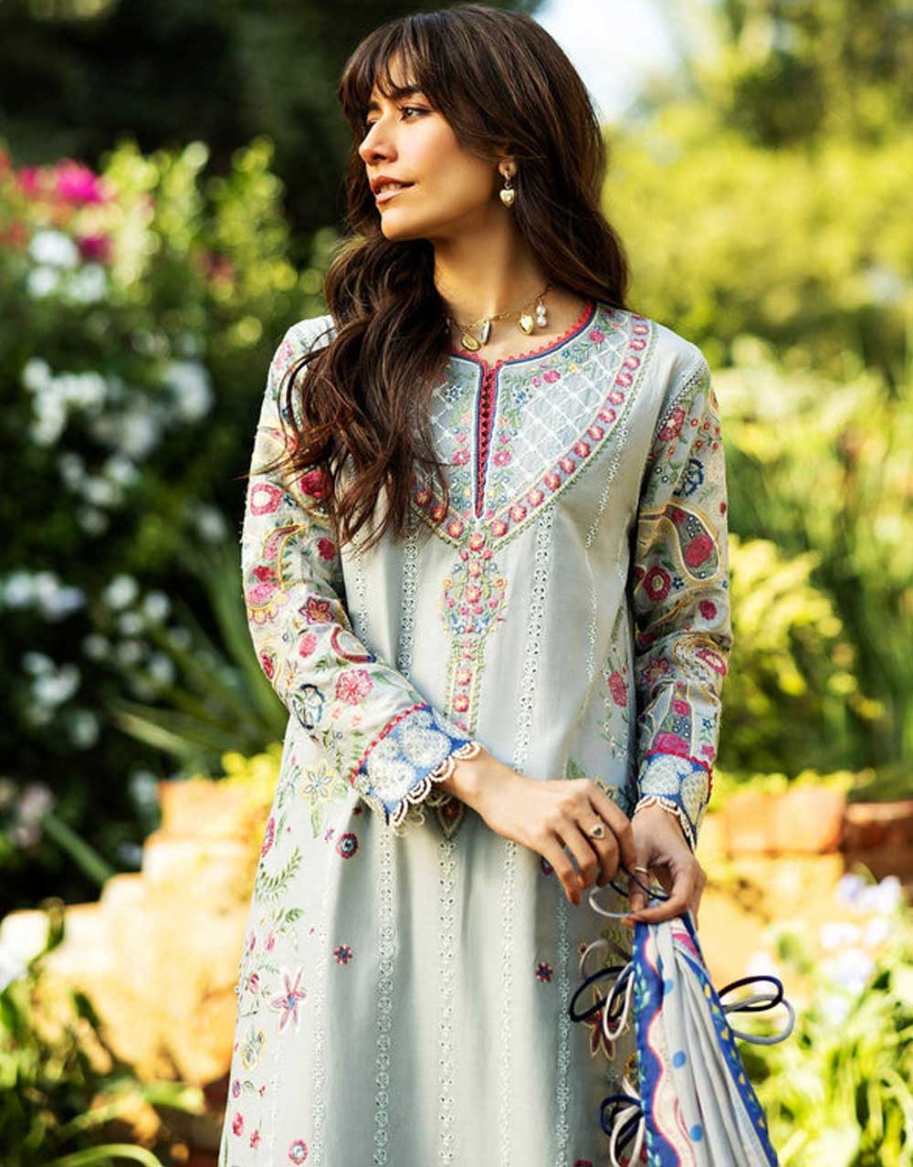 Additional Description: Embroidered lawn Center Panel – 1 piece Embroidered lawn Side Panels (L+R) – 1 piece Embroidered lawn Back – 1 yard Embroidered lawn Sleeves – 0.72 yard Embroidered neckline organza – 1 piece Embroidered shirt border on charmeuse silk – 2 yard Embroidered sleeve border on charmeuse silk – 2 yard Digital Printed silk dupatta – 2.7 yard Dyed Cambric Trouser – 2.16 yard