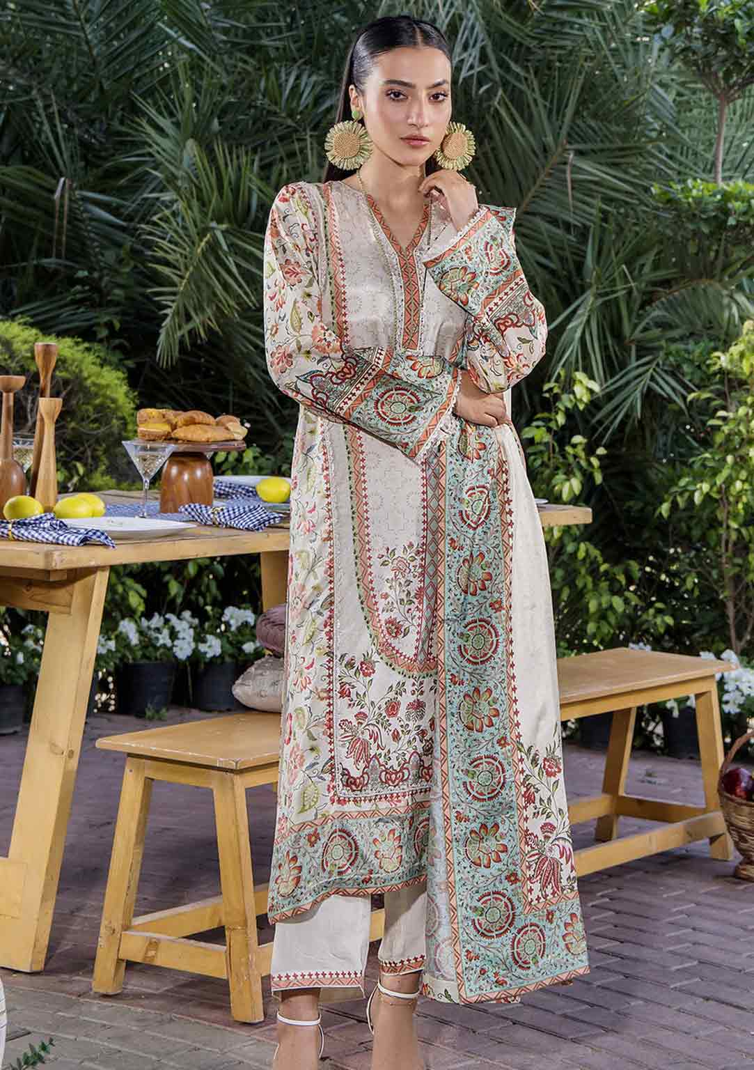 This elegant 3-piece ensemble is crafted from premium raw silk fabric, featuring a long kurta adorned with delicately printed traditional patterns in soft shades of red, green, and beige. Complemented by matching trousers and a richly bordered dupatta, this outfit exudes timeless grace—perfect for garden gatherings or festive luncheons. The luxurious texture and detailed artistry make it a standout choice for refined daytime occasions.