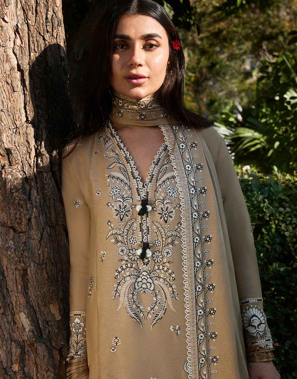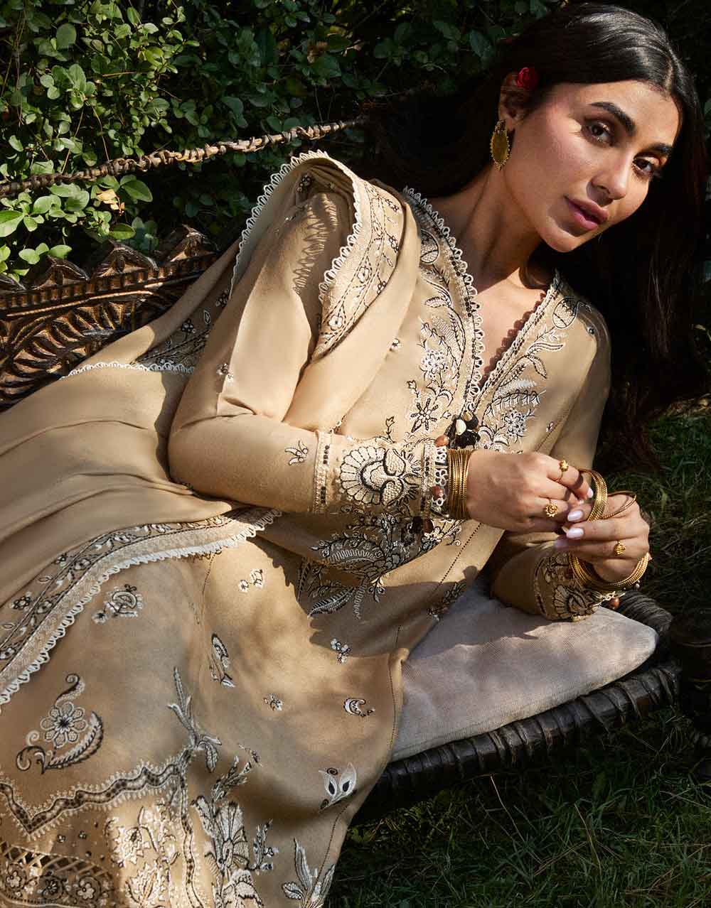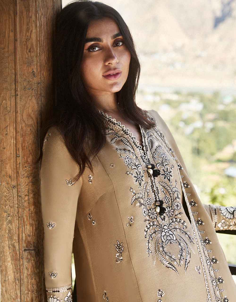 Introducing Banoo, a dreamscape woven in winter’s serene embrace, set within the rustic charm of an old heritage villa nestled high in the mountains. This masterpiece unfolds on a soft beige canvas, adorned with delicate suzani embroidery that whispers of timeless tradition and refined elegance. Inspired by the rich artistry of Central Asia, Banoo pairs tonal trousers with a lavishly embroidered dupatta, enveloping you in warmth reminiscent of snow-laden mornings and crisp, frosty air.
