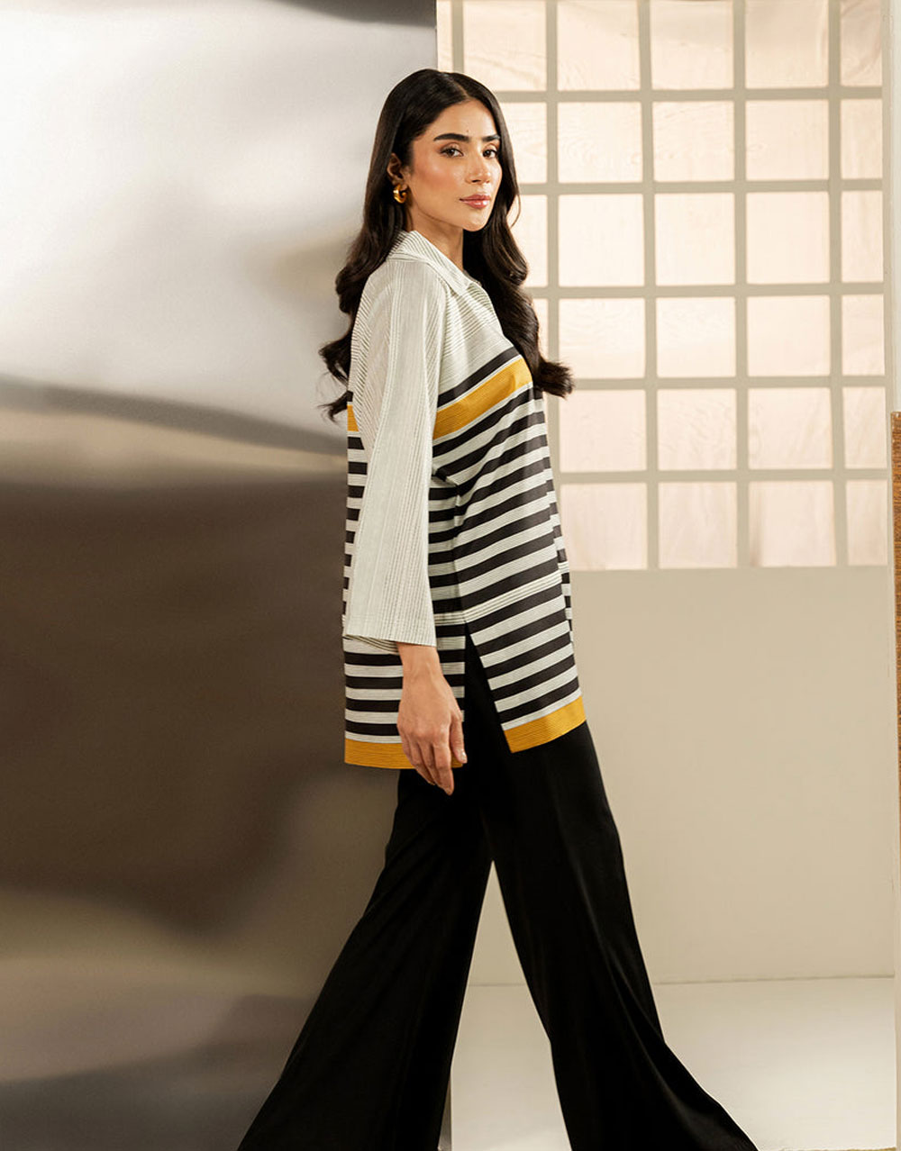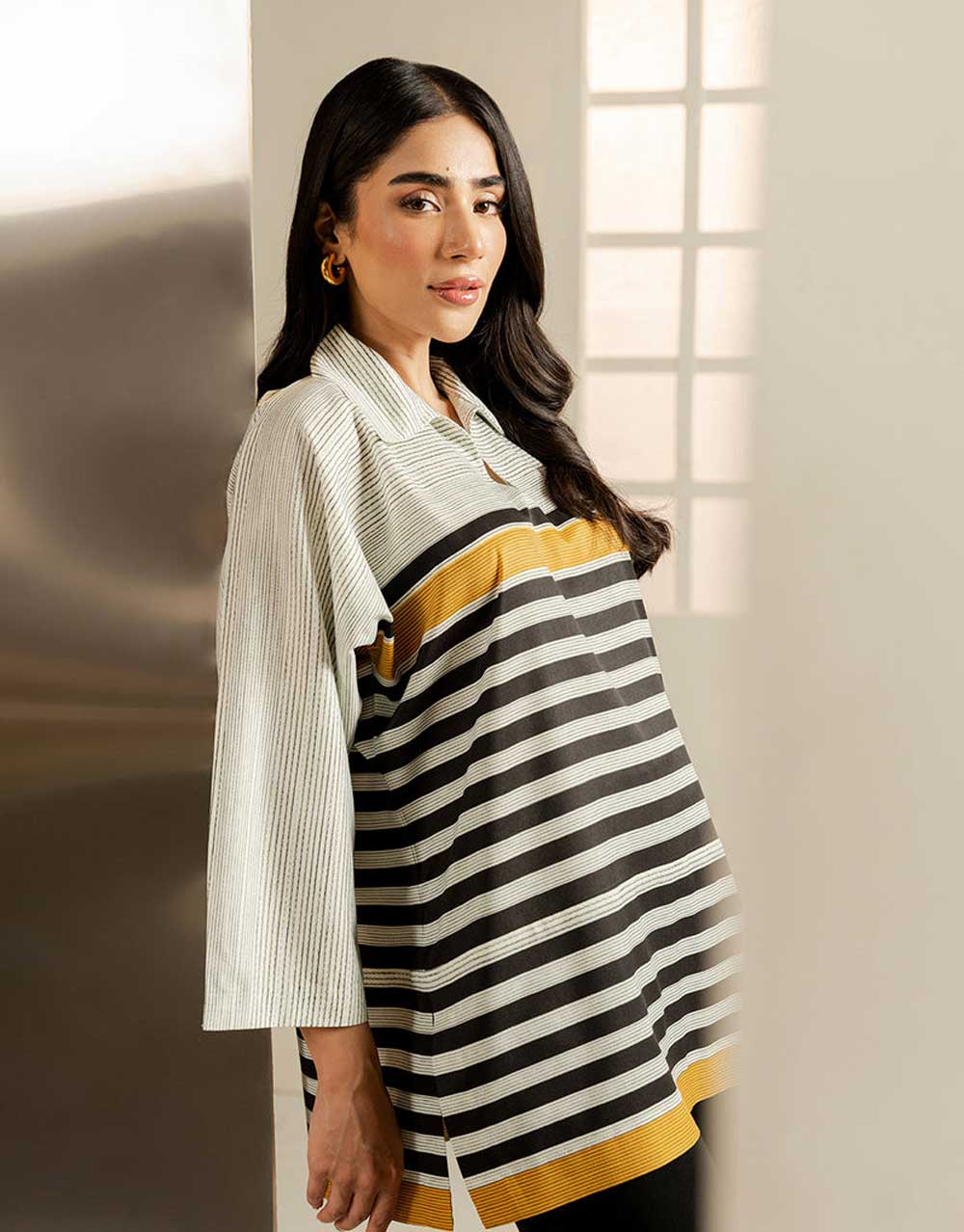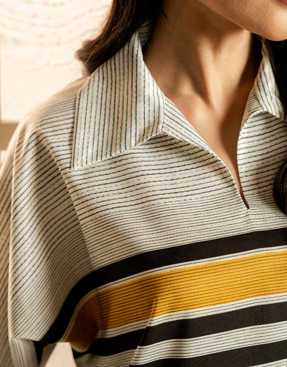 - This top made in soft crepe fabric in striped print features collar neck and kimono sleeves. Length 30″. Model is wearing size S. Model height 5’7″.