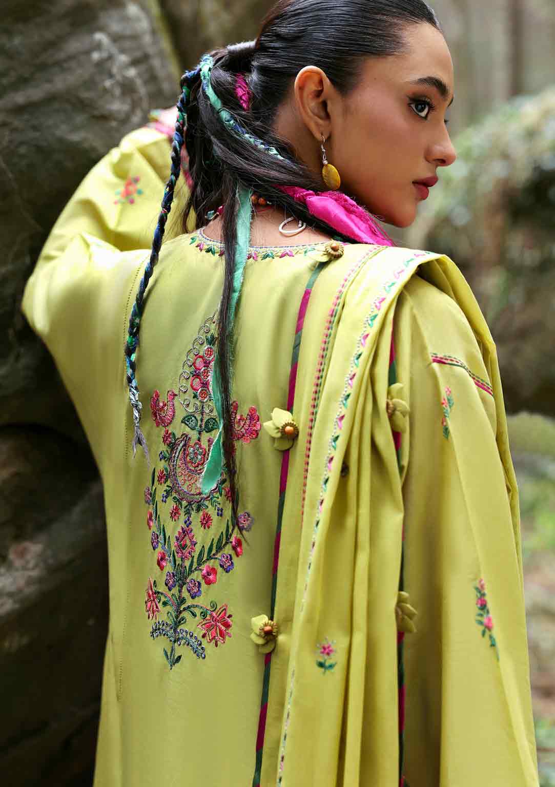 Radiating effortless charm in boho lime yellow, Rhea this statement ensemble is a modern ode to artisanal elegance. Intricate tribal embroideries in pink, sage, and brick dance across the fabric, while delicate laser appliqué work adds depth and dimension. The airy voile dupatta, adorned with embroidered motifs, drapes like a dream, complementing the sleek trousers finished with an embroidered sage border. A meticulously detailed back motif ties it all together, making this the perfect look for the modern muse who embraces tradition with a chic, contemporary edge.