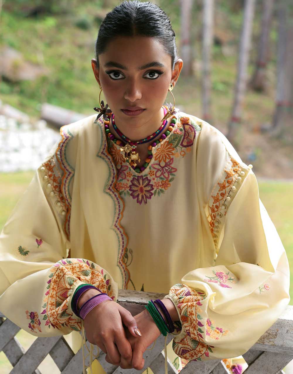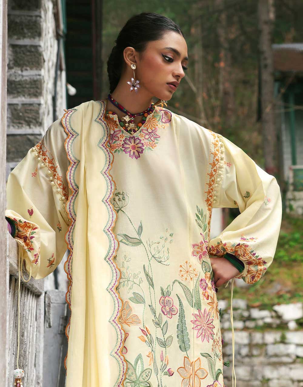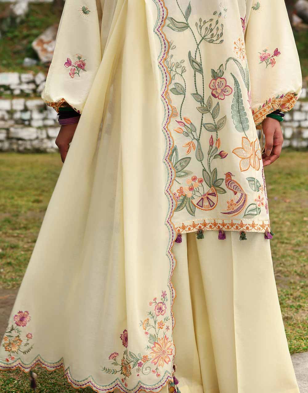 **Zania** – Bathed in a luscious Parmesan yellow, this stunner is a floral fantasy in motion. Schiffli blooms sprawl effortlessly across the shirt, kissed by wildflowers in soft sage, while embroidered blossoms in burnt burgundy and auburn add the perfect pop of contrast. Intricate laser-cut details weave through the fabric, adding depth and modern allure. The tonal voile dupatta, edged with delicate cross-stitch and embroidered floral motifs on the pallus, drapes like a dream. Paired with tonal pants featuring intricate stitch details, **Solène** is the ultimate blend of bold sophistication and effortless Zaha chic.