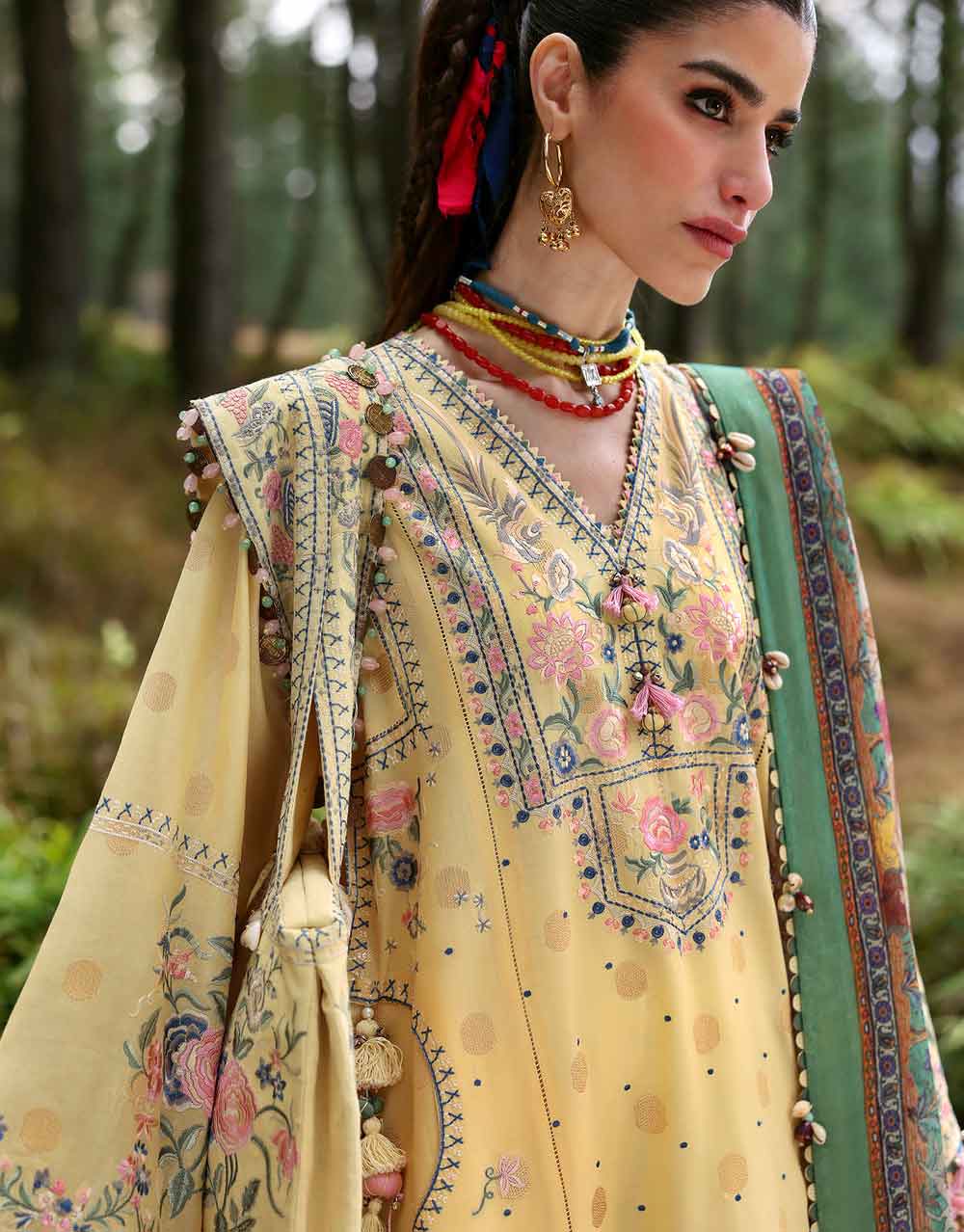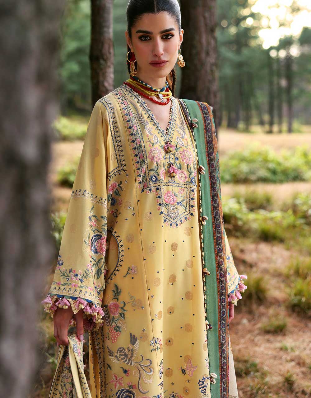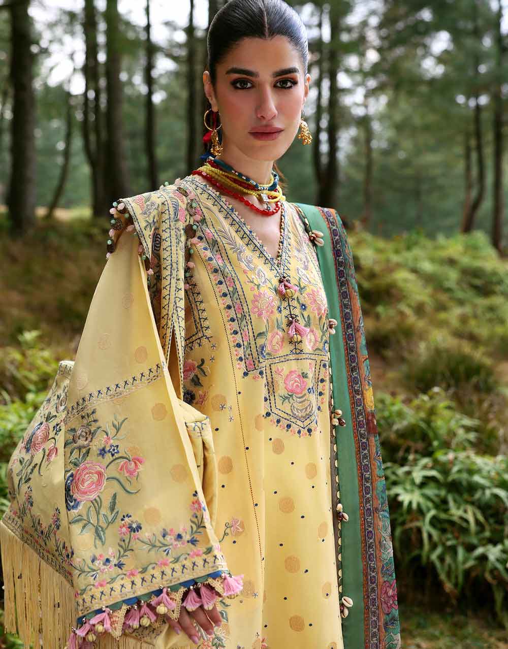 Zuri – A butter-yellow reverie, this self-printed masterpiece is adorned with intricate floral embroideries in soft pink and butter yellow, with delicate butterflies fluttering across the fabric. Paired with a breezy cotton net dupatta featuring an enchanting Shikargarh print, this ensemble is effortlessly chic, light as air, and undeniably graceful. A poetic ode to nature, designed for the Zaha woman who exudes elegance with a touch of whimsy.