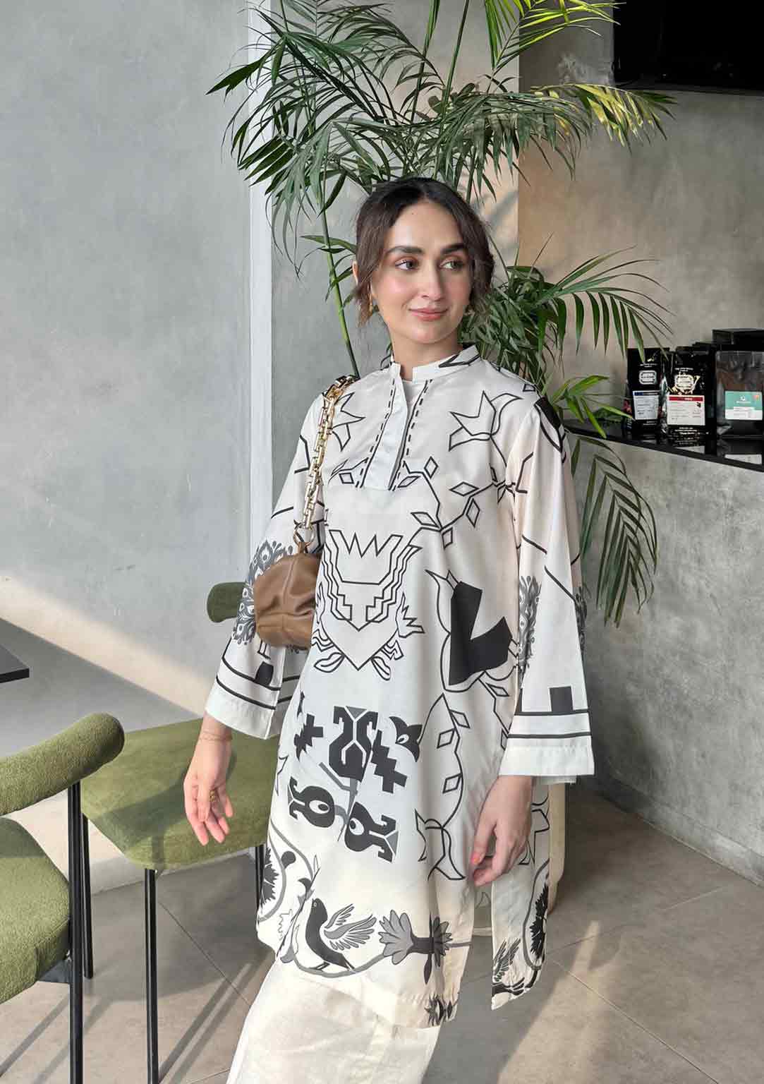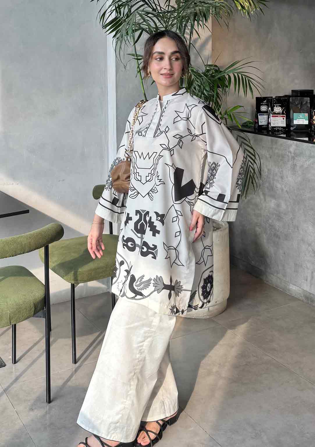 - Printed shirt having collared neck kurta style pattern paired with plain base colour cotton-lawn loose trouserFabirc: Poly lawn